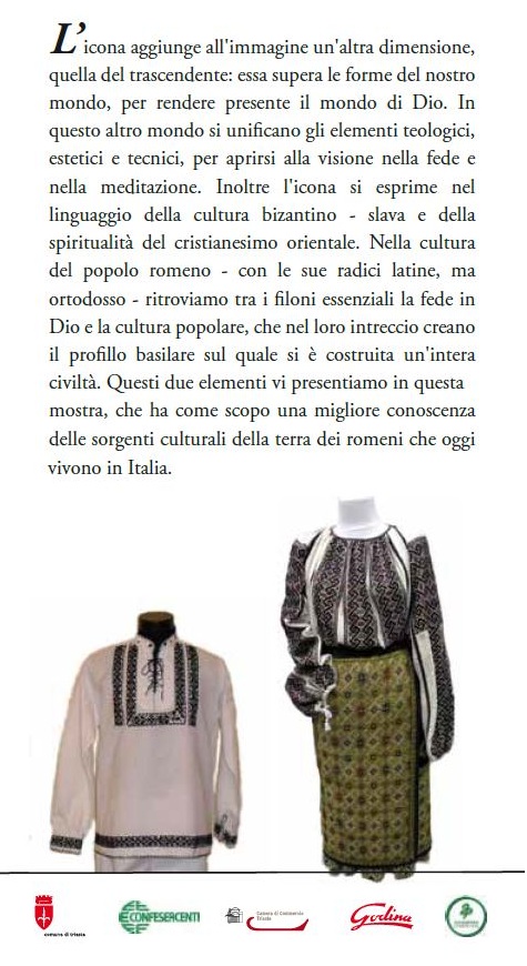 Romanii din Trieste si vecinatatile orasului au reusit sa organizeze la Palazzo Gopcevic, via Rossini nr 4, pentru perioada 3-15 septembrie 2011, o expozitie de icoane ortodoxe si port traditional romanesc. Icoanele au fost aduse de la bisericile romanesti din zona iar costumele nationale sunt realizate de romanii veniti la Trieste de pe ambele maluri ale Prutului. Organizatorii, care au dorit sa-si pastreze bucuria anonimatului, ne-au transmis ca au realizat expozitia cu binecuvantarea Parintelui Justin Parvu, ca un imbold si pentru alte comunitati romanesti din Italia, pentru a-si intari sentimentul national. “Nici un popor nu-si poate continua drumul spre mantuire daca nu isi pastreaza traditia si identitatea”, sunt cuvintele Parintelui Justin sub care romanii din Italia, asteptati sa se intoarca acasa, in tara, au alcatuit expozitia, deschisa pana joi, 15 septembrie.