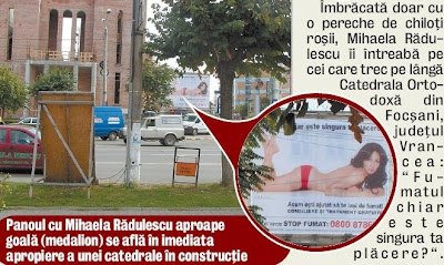Va aducem la cunostinta urmatoarea situatie care nelinisteste comunitatea ortodoxa din orasul Focsani, fiind un atac la adresa Bisericii, a celor care inteleg sa traiasca si sa-si educe copiii in spiritul valorilor traditionale crestine: Cooperativa “Sporul”, cu sediul langa Catedrala Ortodoxa cu hramul Sf. Parascheva, a incheiat un contract de inchiriere cu firma “Clear Channel Romania” din Bucuresti care promoveaza campania anti-fumat ce foloseste imaginea Mihaelei Radulescu intr-o ipostaza total nepotrivita, sugerand inlocuirea unei patimi cu alta. Afisul de afla la cativa metri de Sf. Altar al Catedralei nostre.